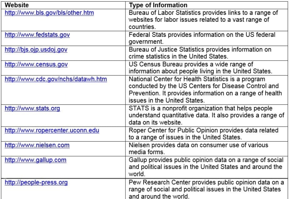 Fixed Statistics Table for 7.1 listing BLS, FedStats, BJS, Census, CDC, STATS, Roper Center, Nielsen, Gallup, and Pew Research Center.