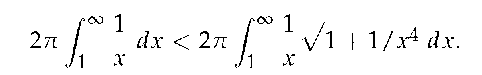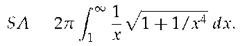 The improper integral on the left diverges. Since the integral on the right is larger, we conclude it also diverges, meaning Gabriel's Horn has infinite surface area.