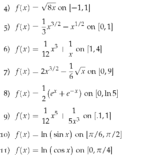 In Exercises 3-11, find the arc length of the function on the given integral.