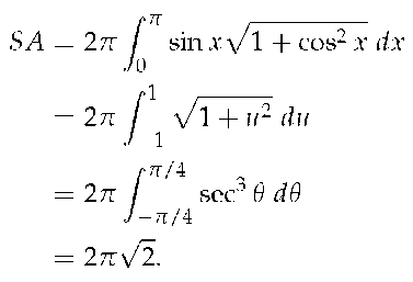 Solution. This is somewhat of a mathematical curiosity; in Activity 4.51 (b) we found the area under one "hump" of the sine curve is 2 square units; now we are measuring its arc length.