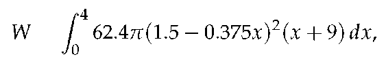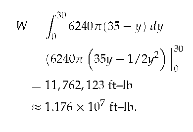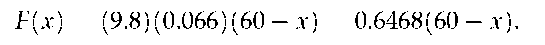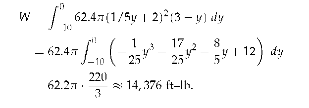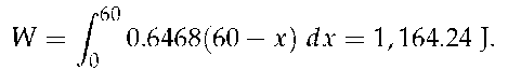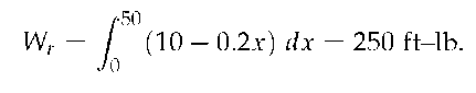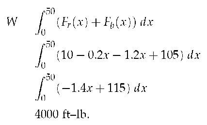 1. We start by forming the force function Fr( x) for the rope (where the subscript denotes we are considering the rope). As in the previous example, let x denote the amount of rope, in feet, pulled in. (This is the same as saying x denotes the height of the box.) The weight of the rope with x feet pulled in is Fr (x) = 0.2(50 — x) = 10 — 0.2x. (Note that we do not have to include the acceleration of gravity here, for the weight of the rope per foot is given, not its mass per meter as before.) The work performed lifting the rope is
