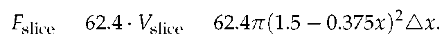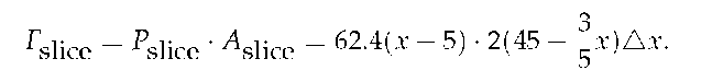 At any point on this slice, the depth is approximately constant, and thus the pressure can be considered constant. In particular, we note that since x measures the distance to the top of the dam, and because the water rises to within 5 feet of the top of the dam, the depth of any point on the representative slice is approximately (x — 5). Now, since pressure is given by P = 62.4d, we have that at any point on the representative slice