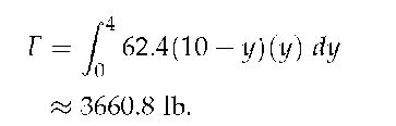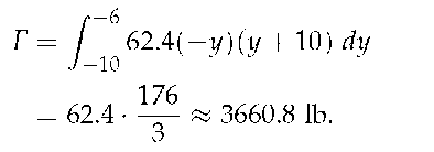 As the surface of the water is 10 ft above the base of the plate, we have that the surface of the water is at y = 10. Thus the depth function is the distance between y = 10 and y; d(y) = 10 y. We compute the total fluid force as: