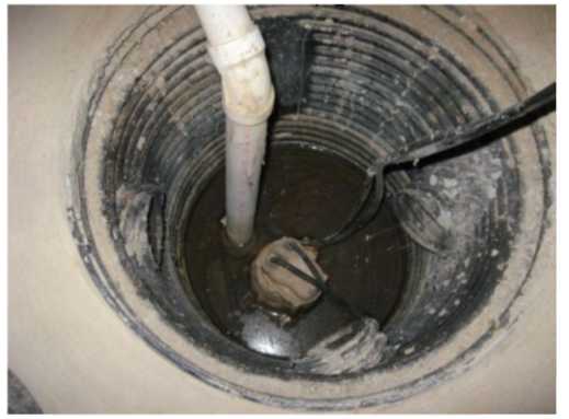 In certain geographic locations where the water table is high, residential homes with basements have a peculiar feature: in the basement, one finds a large hole in the floor, and in the hole, there is water. For example, in Figure 6.30 where we see a sump crock2. Essentially, a sump crock provides an outlet for water that may build up beneath the basement floor; of course, as that water rises, it is imperative that the water not flood the basement. Hence, in the crock we see the presence of a floating pump that sits on the surface of the water: this pump is activated by elevation, so when the water level reaches a particular height, the pump turns on and pumps a certain portion of the water out of the crock, hence relieving the water buildup beneath the foundation. One of the questions we'd like to answer is: how much work does a sump pump accomplish?
