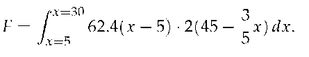 Finally, we use a definite integral to sum the forces over the appropriate range of x-values. Since the water rises to within 5 feet of the top of the dam, we start at x = 5 and slice all the way to the bottom of the dam, where x = 30. Hence,
