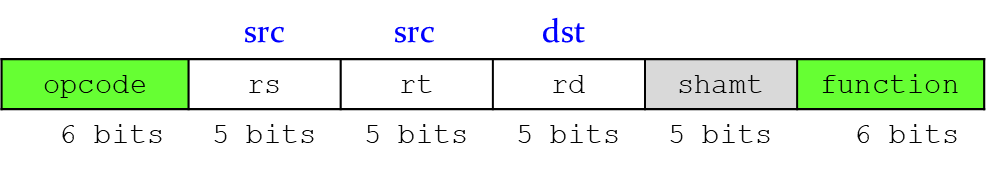The name R-type is short for register-type. The following figure shows the R-type instruction fields.