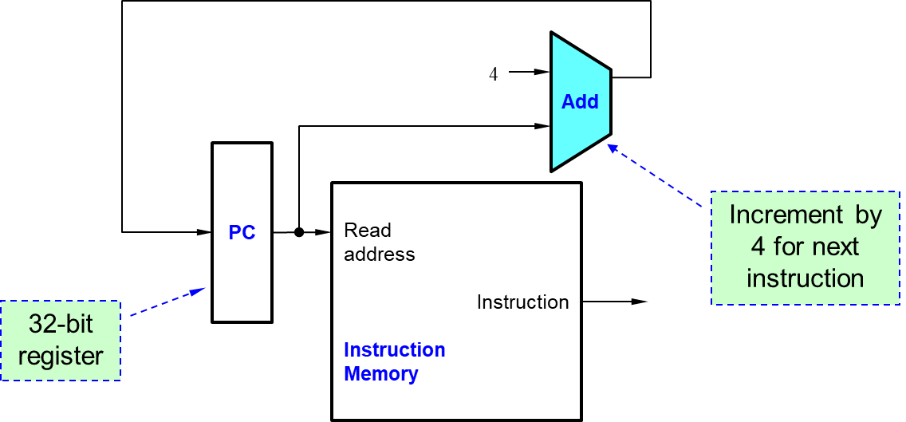 Program Counter (PC) is a 32-bit register which holds the address of the next instruction to be fetched from the memory. PC value is increased by 4 for the next instruction, as shown in the following figure. The instruction memory fetches the instruction from the memory, and forward the instruction to the next step.