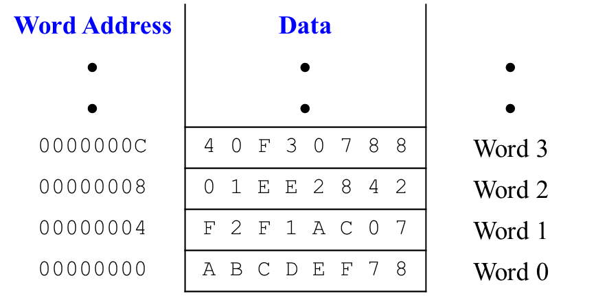 When we execute instructions, there are too much data to fit in only 32 registers. The memory has a lot of capacities to store data. The register file is small and fast, whereas memory is large and slow, because the memory is located outside the CPU. Only commonly used variables are kept in registers. The rest of them are kept in memory for a future processing. As shown in the below, each 32-bit data word has a unique 32-bit address. This is called word-addressable memory. Both the 32-bit word address and the 32-bit data value are written in hexadecimal.