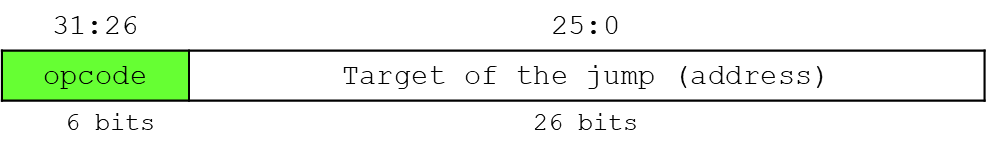 The J-type instruction is used to jump the target of the address. The following figure shows the J-type instruction field.