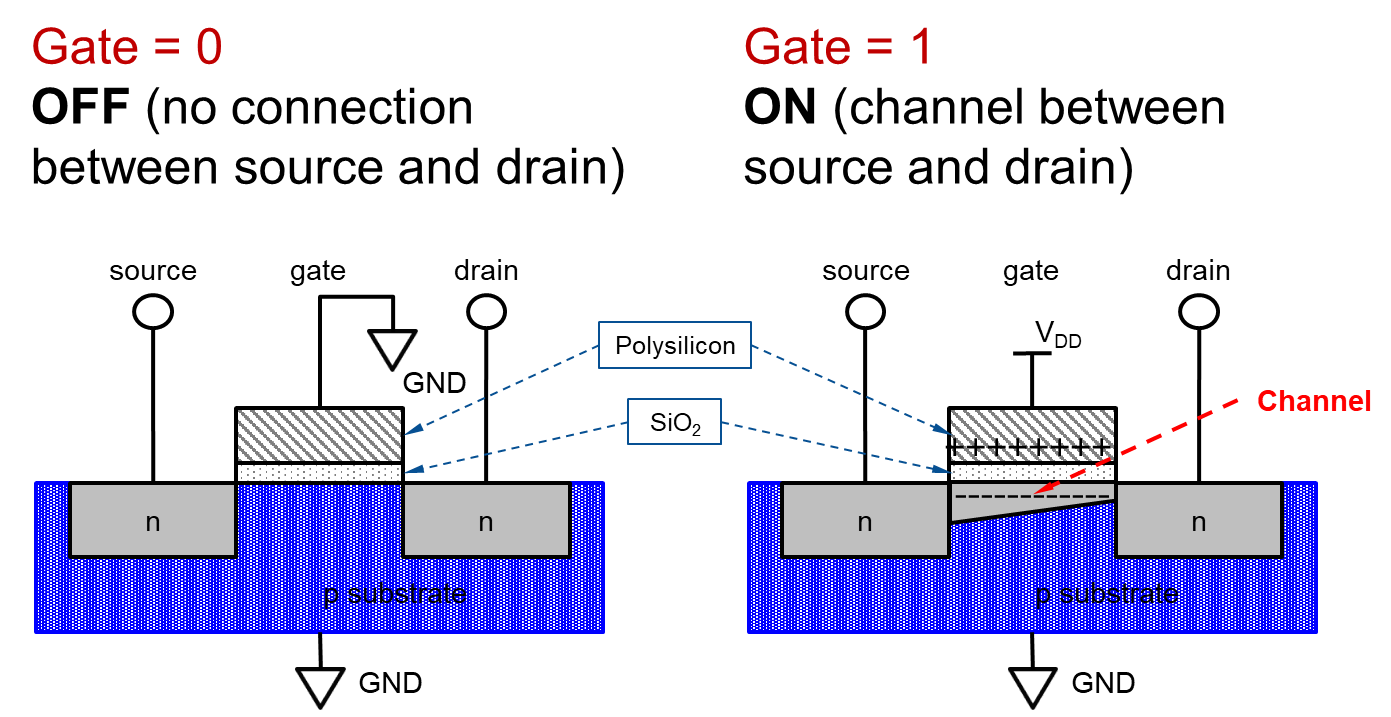 As shown on the left of Fig. 2-11, if the gate voltage is low (Gate = 0), the polysilicon gate has the negative voltage and the substrate has the positive feature. There is nothing happened, meaning the source and the drain are not connected. If the gate voltage is HIGH (Gate = 1), the polysilicon gate has the positive voltage (+) and the substrate also has the positive feature. The positives push each other. It attracts the negative feature (electron: −) on the surface of the silicon dioxide insulator, which creates a channel to connect the source and the drain, meaning the source and the drain are connected.