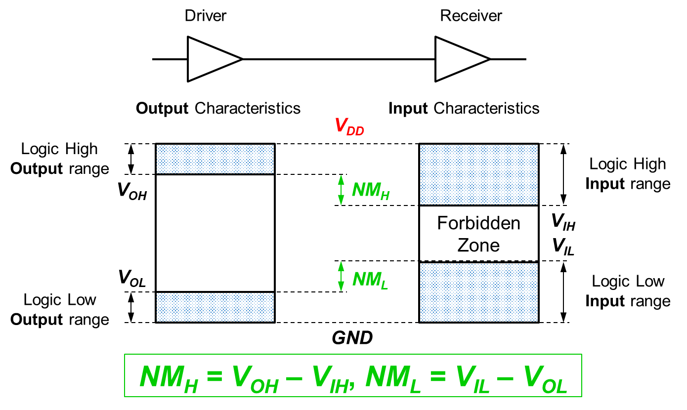 The voltage level difference between the logic output high (VOH) and the logic input high (VIH) is called the noise margin for the logic high, whereas the voltage level difference between the logic input low (VIL) and the logic output low high (VOL) is called the noise margin for the logic low.
