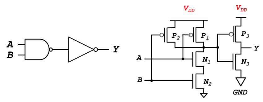 By connecting the output port of CMOS NAND logic gate to the input port of CMOS NOT logic gate, we can design AND gate, as shown in the following figure: