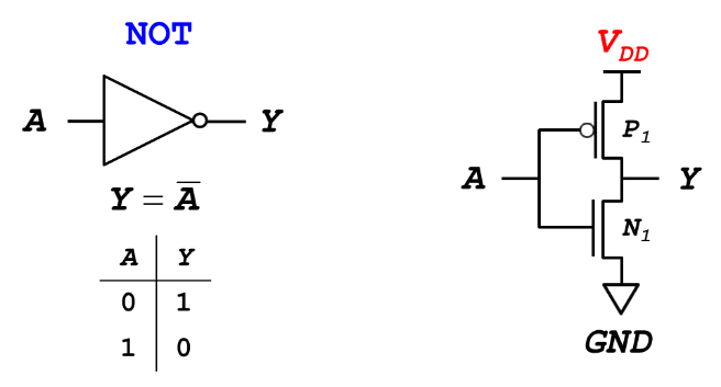 - The logic input A connected to the gate ports of both pMOS transistor (P1) and nMOS transistor (N1).