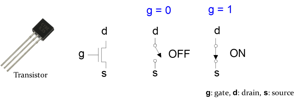 We can build logic gates (AND, OR, XOR, etc.) from transistors. The transistor is a 3-ported voltage-controlled switch with g: gate, d: drain, and s: source. Two ports, i.e. drain and source, can be connected depending on the voltage status of the gate. If the gate voltage is LOW (g = 0), the switch is OFF. If the gate voltage is HIGH (g = 1), the switch is ON.