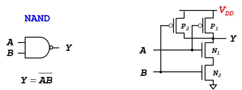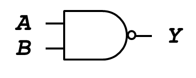 For the two-input NAND gate, the output Y is NOT true only if both input A and input B are “1” or HIGH; otherwise the output Y is true, that gives us the Boolean expression of: . The following figure shows the symbol and the truth table of the two-input NAND gate.