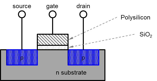 The Metal oxide silicon (MOS) transistor has the polysilicon (used to be metal) on the gate. The oxide (silicon dioxide) insulator isolates the substrate (p-type silicon: a positively charges silicon) from the polysilicon.
