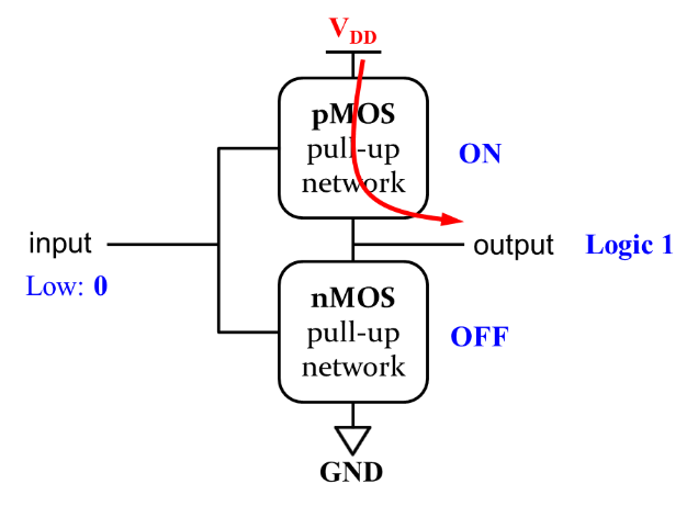 If the gate voltages of both nMOS and pMOS transistors are HIGH (logic “1”), the pMOS transistor is OFF and the nMOS transistor is ON. The output port has the GND voltage (logic “0”). If the gate voltages of both nMOS and pMOS transistors are LOW (logic “0”), the pMOS transistor is ON and the nMOS transistor is OFF. The output port has the VDD voltage (logic “1”).