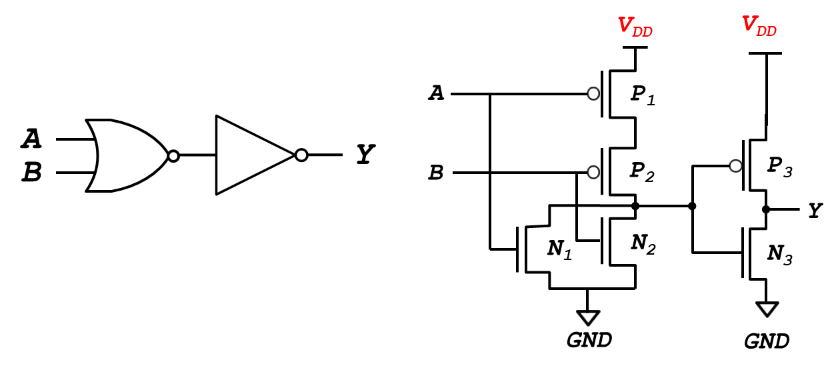 By connecting the output port of CMOS NOR logic gate to the input port of CMOS NOT logic gate, we can design OR gate, as shown in the following figure: