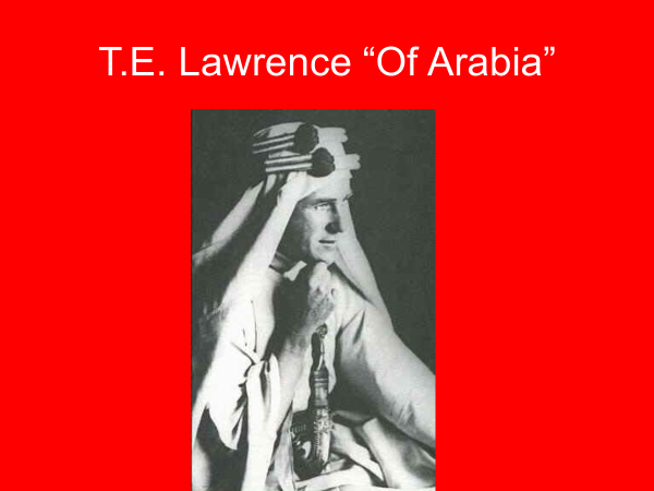 The Arabs in the Middle East had been nominally ruled by the Ottoman Turks for centuries. During World War I, the Entente powers, especially Britain, had incited the Arabs to rise and fight against their Ottoman masters. T.E. Lawrence, the famous “Lawrence of Arabia” was a British officer who had gone to the Middle East and helped bring the Arabs into the war against the Ottomans. Lawrence fought alongside the Arabs and grew to have great respect for them.