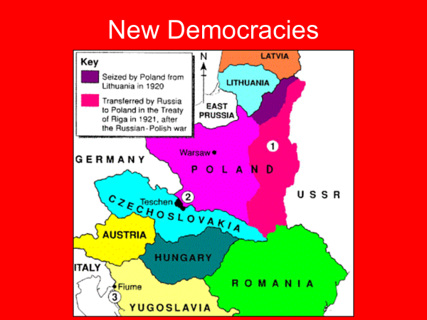 In Czechoslovakia, there were Czechs and Slovaks, both of which were Slavic peoples, although the Czechs were more numerous and more advanced politically and economically. There were also many German and Hungarian minorities in Czechoslovakia. The Germans numbered around three million and they lived in Sudeten mountains on the frontier of Bohemia and Moravia. This area came to be known as the Sudetenland. This German area would be one of Hitler’s main goals in the 1930’s. Giving this area over to Czechoslovakia was a clear violation of Wilson’s principle of National Self-determination- b/c these people did not want to be a part of Czechoslovakia.