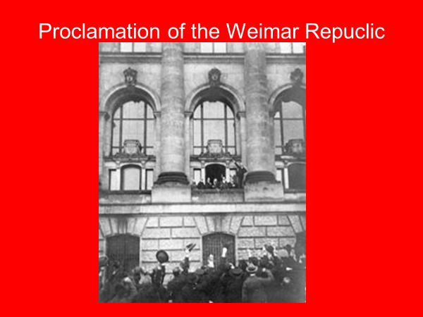 The new Weimar Republic in Germany began with a revolution which began with a mutiny among sailors at Kiel in October 1918. There sailors were among the many people in Germany that were tired of the war and wanted it over. The revolution spread quickly and led to the collapse of the government and the abdication of Kaiser William II. The Social Democratic party proclaimed a republic on November 11, 1918, and Friedrich Ebert became president of the Weimar Republic of Germany.