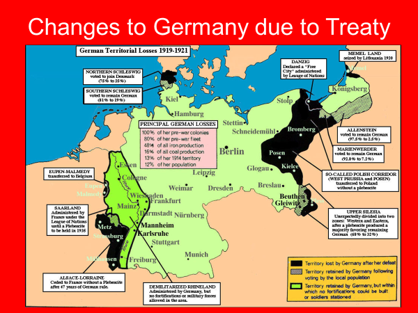 Germany was assigned sole blame for the war and forced to lose territory and pay reparations.