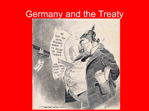 The treaty was presented to the German delegation on May 7th, 1919. The only way to describe the German reaction was amazement mixed with consternation. In looking at the treaty, apart from the League of Nations, they saw very little that resembled the Fourteen Points, which they felt was going to be the basis for the peace when they signed the armistice agreement.