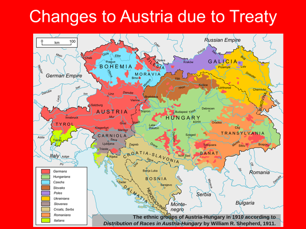 The Austro-Hungarian Empire was dissolved, with new nation-states created out of its former territories, which sometimes did not follow the principle of self-determination.