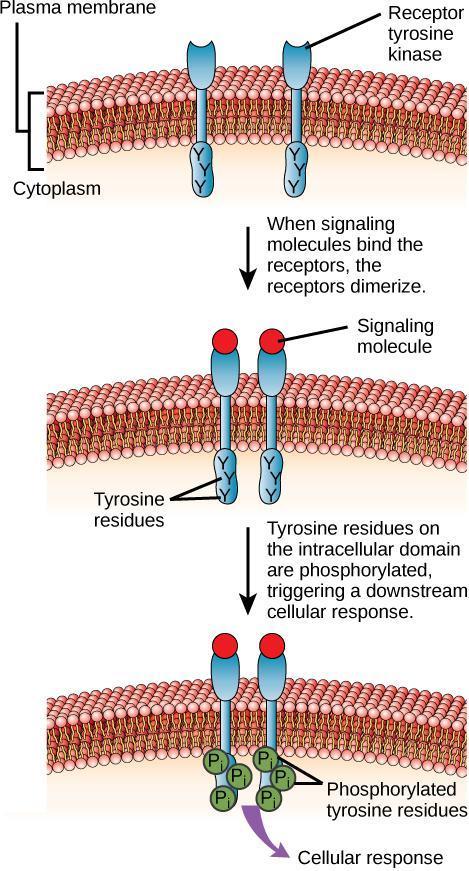 Receptor Tyrosine Kinases (RTKs) are cell-surface receptors with intracellular domains that have intrinsic enzymatic activity. RTKs are dimers, meaning they consist of two proteins subunits. When a signaling molecule binds to the extracellular domains of the RTKs, the two halves of the receptor dimerize (the two dimers join together). The intracellular domains of each RTK dimer have kinase enzymatic activity that is only active when the two subunits are brought together after binding the signaling molecule on the surface of the cell. Upon dimerization, the RTK completes autophosphorylation by transferring phosphate groups to tyrosine residues within the receptor itself. The phosphate groups on the intracellular domains provide docking sites for adaptor proteins that initiate an intracellular signaling cascade (Figure 12-7).