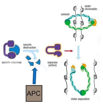Figure 13-4: Regulation of sister chromatid separation during anaphase. APC (anaphase promoting complex) polyubiquitinates secruin, leading to the proteasomal degradation of secruin. This allows separase to become active. Separase cleaves cohesins, allowing sister chromatids to be pulled apart by microtubules.