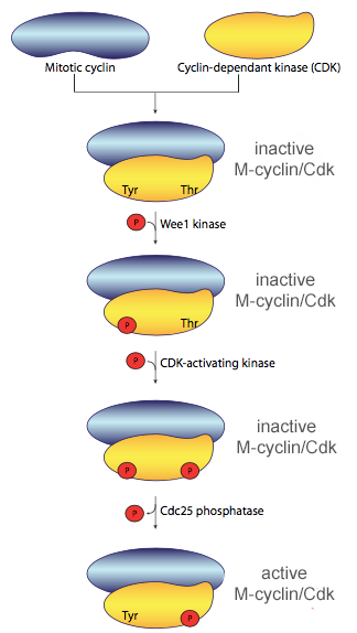 Figure 13-9: Activation of mitotic cyclin/Cdk complex. The M-Phase cyclin/Cdk complex is inactive until inhibitory phosphates have been removed and activating phosphates have been added to the protein. This ensures the specific timing of M-Phase cyclin/Cdk kinase activity in the cell cycle.