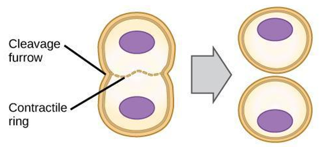 In animal cells, cytokinesis begins following the onset of anaphase. A contractile ring composed of actin filaments forms just inside the plasma membrane at the former metaphase plate. The actin filaments pull the equator of the cell inward, forming a fissure. This fissure, or “crack,” is called the cleavage furrow. The furrow deepens as the actin ring contracts, and eventually, the membrane and cell are cleaved in two (Figure 13-5).