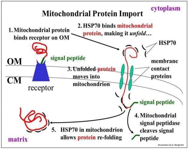 For the protein to cross through this translocation channel, it must be unfolded, or linearized, during import and then refolded upon entry into the mitochondria. But there is a problem: the folded protein cannot cross the membrane by itself! The entry of a fully translated mitochondrial protein from the cytoplasm requires a so-called chaperone protein, in this case, the HSP70 (heat-shock 70) protein. HSP70 controls unfolding of the mitochondrial protein as it passes into the mitochondrial matrix. Upon removal of the signal peptide by a mitochondrial signal peptidase, another HSP70 molecule resident in the mitochondrion facilitates refolding of the protein into a biologically active shape.