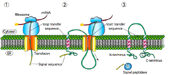 Building on the single-pass example, if there were another signal patch after the stop-transfer sequence, it would act as a start-transfer sequence, attaching to a translocon and allowing the remainder of the protein to be moved into the ER. This results in a protein with both N- and C- termini in the ER lumen, passing through the ER membrane twice, and with a cytoplasmic loop sticking out (Fig 9-5).