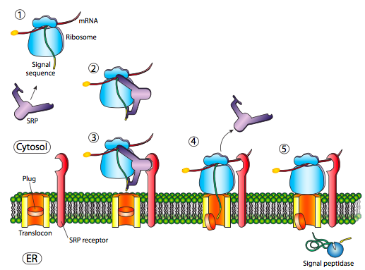 Figure 9-3: SRP and its receptor SR mediate movement of proteins through the ER membrane. The SRP recognizes the signal sequence and binds to it and the ribosome, temporarily arresting translation. The SRP-polypeptide-ribosome complex is bound by its receptor, SR, which positions the complex on a translocon. Once the ribosome and polypeptide are docked on the translocon, the SRP dissociates, and translation resumes, with the polypeptide moving through the translocon as it is being synthesized.