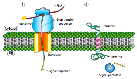 Figure 9-4: Single-pass transmembrane protein insertion. (1) The signal sequence has allowed the ribosome to dock on a translocon and newly made polypeptide is threaded through until the stop-transfer sequence. (2) The hydrophobic stop transfer sequence gets “stuck” in the membrane, forcing the rest of the polypeptide to stay in the cytoplasm as it is translated.