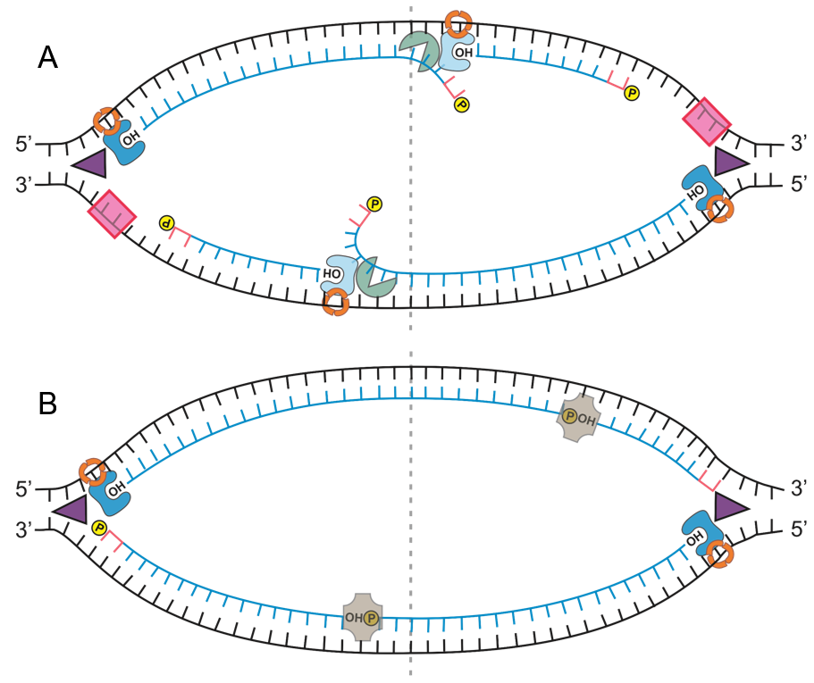 Figure 14-4: Process of removing RNA primers and ligating DNA strands. (A) Lagging strand DNA polymerases will run into neighboring RNA primers, displace them, and flap endonucleases (RNase H2 and FEN-1-teal PacMan™) will remove them. The DNA polymerases will replicate any remaining nucleotides and then disassociate with the DNA leaving a nicked backbone. (B) DNA Ligase (shown in tan) will connect the free 3’-hydroxyl and 5’-phosphate groups fixing the broken backbone. The short RNA/DNA fragments generated on the lagging strand are called Okazaki fragments. (Illustration by Christopher G. Brown)