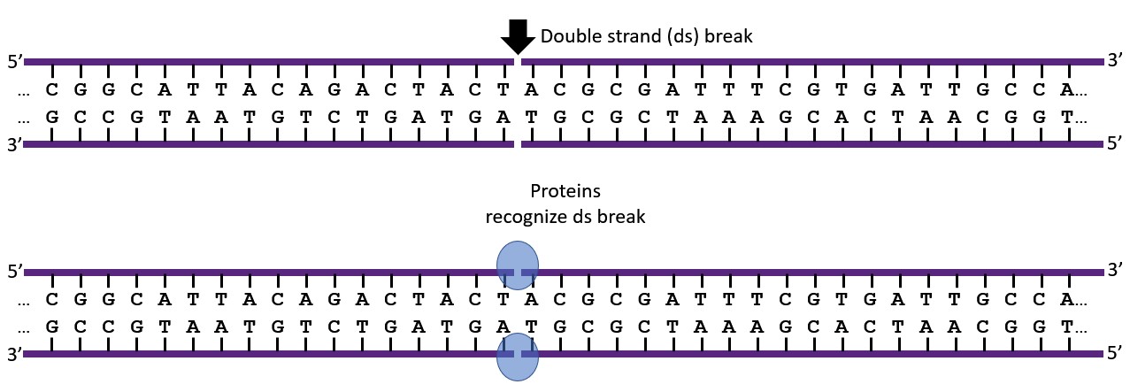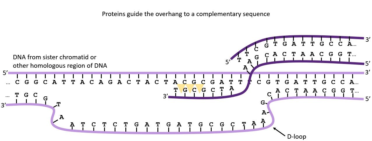 Homologous recombination is carried out by a number of proteins whose activities are coordinated. Figure 14-15 shows this process. First, some proteins recognize the double-strand break and recruit exonucleases that resect, or remove nucleotides from the broken ends. It might seem strange that the cell is deleting some nucleotides, but this process ensures repair of the break without losing DNA sequence (unlike in the results of Non-Homologous End Joining). Temporarily deleting bases helps to create a DNA overhang, the 3’-DNA overhang is single-stranded, meaning the nucleotide bases are unpaired. This allows other proteins to bind to the overhang and they use the sequence of the overhang to “search” for a complementary sequence to use to repair itself. The complementary sequence is often found on the neighboring sister chromatid, which would only be present after S phase), or perhaps from the homologous chromosome. Once the complementary sequence is found, proteins will “invade” the homologous sequence to allow the overhang to base pair with the complementary sequence. This causes the displacement of the non-complementary strand and the formation of a structure called a “d-loop” (d for displacement). The 3’-end is now aligned with a complementary sequence and DNA polymerase will add complementary bases to the 3’-overhang, replacing the bases that were deleted earlier. Hundreds of bases can be added to the 3’-overhang, eventually providing enough DNA sequence that the overhang can base pair with its original complementary DNA strand. The DNA missing from the complementary sequence can now be filled in by DNA polymerase, and ligase can connect the free 3’ hydroxyl and 5’ phosphate groups. The DNA is now completely repaired, without deleting any genetic information!