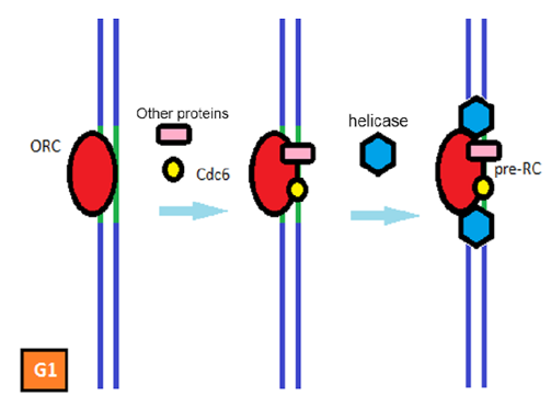 A protein complex called the Origin Recognition Complex (ORC) binds at the origin of replication sequence in the DNA during late M phase/G1 phase of the cell cycle. The ORC interacts with a few other proteins, one known as Cdc6 works with another protein called Cdt1 to help load a complex of proteins known as helicase onto the DNA. (Remember that DNA helicases use ATP to unwind the DNA helix by breaking the hydrogen bonds between paired bases.) The ORC/Cdc6/Cdt1/Helicase complex along with other associated proteins is known as the pre-replicative complex or pre-RC (Figure 14-1). The pre-RC persists until the G1/S transition, which occurs once the cell receives a signal to divide. At the G1/S transition, it is thought that Cdc6 and Cdt1 unbind from the pre-RC and other proteins that are responsible for recruiting additional DNA replication proteins associate with the helicase to form the pre-initiation complex. Interestingly, the ORC is inhibitory to replication and must be removed before replication can proceed.