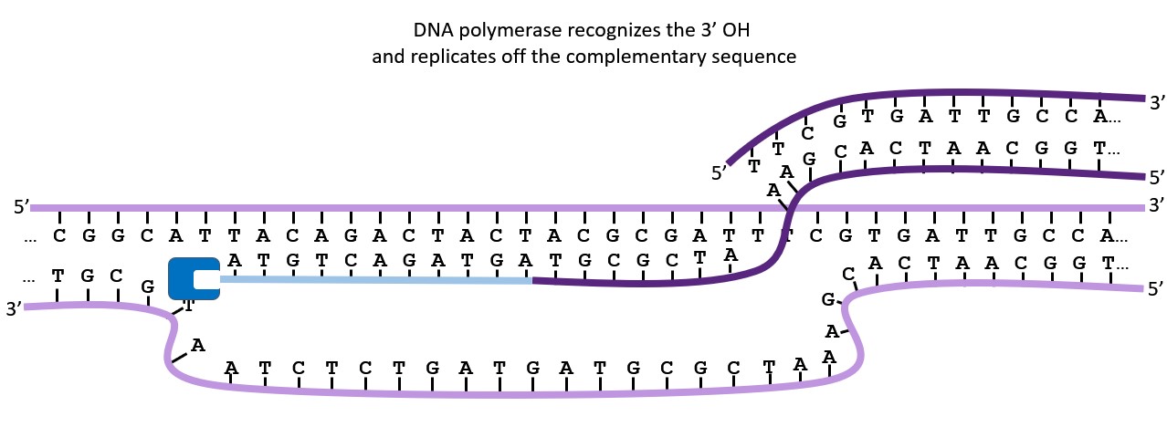 Notice in figure 14-2B that all of the DNA polymerases bind to the 3’-OH group on the RNA primer to initiation DNA replication.