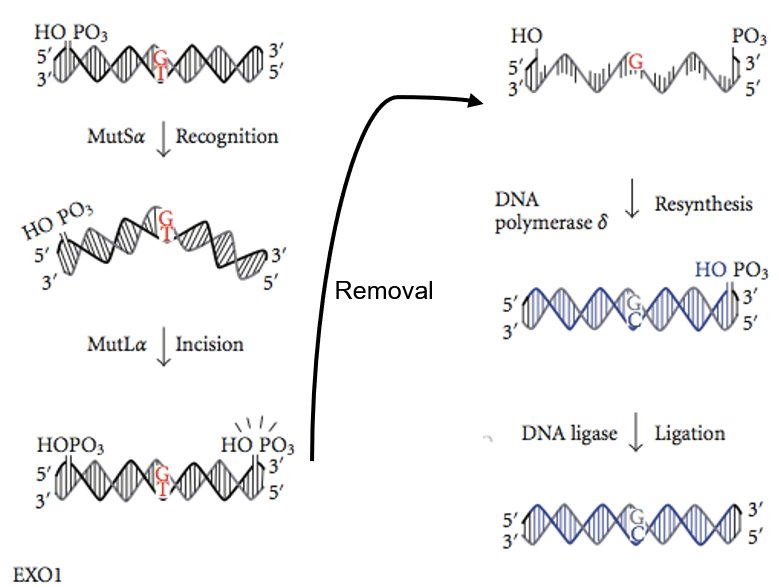 Figure 14-13: Mismatch Repair. The repair proteins MutSα detects the mismatch, MutLα uses endonuclease activity to break the phosphodiester backbone on the 5’ side of the mutation, it is thought Exo1 may be involved in breaking the backbone on the 3’ side of the mutation and then a helicase unwinds the DNA strands releasing the mutated strand of DNA. DNA polymerase δ replicates the DNA using the parental strand as a template and ligase fixes the nick in the backbone.