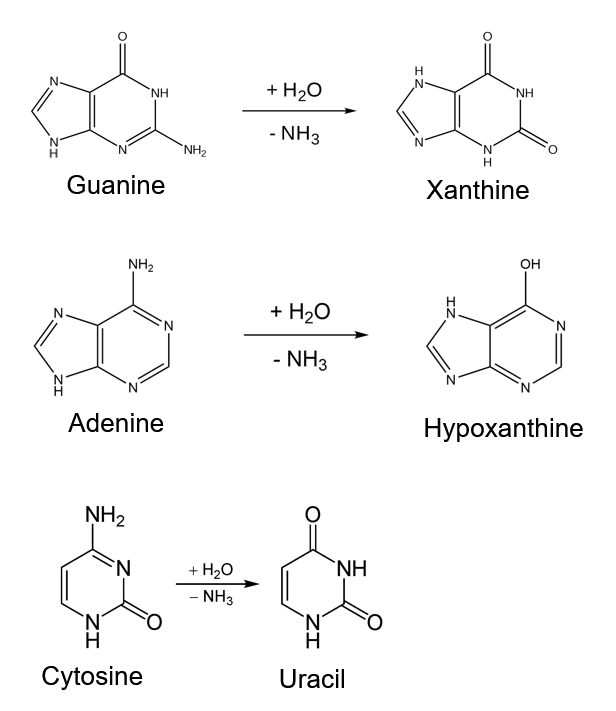 Deamination- the hydrolytic removal of amino (-NH2) groups from guanine (most common), cytosine or adenine. This mutation changes the chemical structure, and therefore changes the base attached to the backbone.