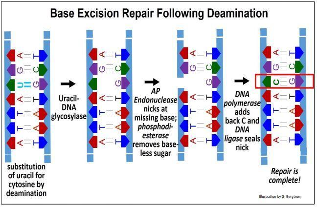 The simplest damage to DNA during replication is called a point mutation, which is the result of the accidental insertion of a ‘wrong’ nucleotide into a growing DNA strand. Other mutations include DNA deletions, duplications, and inversions, any of which might escape repair. The causes of DNA damage can be chemical or physical and can be the result of spontaneous intracellular events (e.g., oxidative reactions) or environmental factors (radiation, exogenous chemicals, etc.). Based on studies of different kinds of DNA damage, it is estimated that DNA damaging events might be occurring at the rate of 10,000 per day; therefore there must be important DNA repair pathways at work to protect cells against such a high rate of DNA damage. Environmental factors that can damage DNA include UV light, X-rays and other radiation, as well as chemicals (e.g., toxins, carcinogens, and drugs.). Both germline (sex cells) and somatic (non-sex) cells can be affected. While mutations can and do cause debilitating diseases, most mutations are likely silent; they do not cause disease, or we do not detect any effect associated with the mutation. Besides, most DNA damage is repaired. Cells correct more than 99.9% of mistaken base changes before they have a chance to become mutations. That is why we think of replication as a “faithful” process. Let’s look at some common types of DNA damage that are usually repaired: