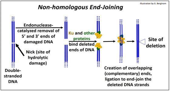 DNA replication errors can cause double-stranded breaks, as can environmental factors (ionizing radiation, oxidation, etc.). Repair by non-homologous end-joining (NHEJ) fixes damage due to breaks in the phosphodiester backbone, by deleting damaged and adjacent DNA and rejoining the ‘cut’ ends as shown in Figure 14-14.