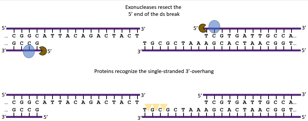 Figure 14-15: Repair of a double-strand break by HRR. The thick black arrow identifies where a double-strand (ds) break has occurred. First proteins (blue spheres) recognize the break in the backbone of the DNA, these help to recruit other proteins known as exonucleases (brown Pac Man) to remove some nucleotides from the 5’ ends. This is known as resection and allows for the formation of a 3’-single-stranded overhang. Other proteins (yellow triangles) recognize and bind the overhang sequence. These proteins “guide” the overhang to a region of homologous DNA sequence on a different DNA strand, usually a sister chromatid (after S phase) or a homologous chromosome. The overhang “invades” the donor DNA helix and displaces a strand of DNA, forming a structure called a d-loop. DNA polymerase (blue kidney bean structure) recognizes the free 3’-hydroxyl group and uses the donor DNA template to replace the deleted nucleotides. At some point, the repaired DNA strand becomes free of the donor DNA and hydrogen bonds back to its original DNA sequence. Polymerase finishes replicating any areas it can and then ligase comes in to connect the DNA fragments together. Please note that this figure is illustrating one way a ds break is repaired using homologous sequences; this version is called synthesis-dependent strand annealing. There are other ways that are more complex the cell can use to repair ds breaks. (Illustration by Jennell Talley)