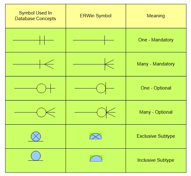 - Eriwin uses solid vs. dashed lines for M:N relationships; this can only be specified on “children” in a relationship. These features mean that nearly any E-R diagram created using erwin will be incorrect for this text. Figure_1 below illustrates the differences between the notation used in the text and the notation used by erwin.