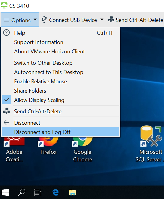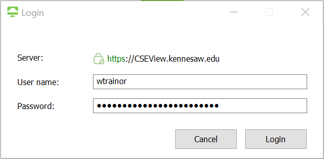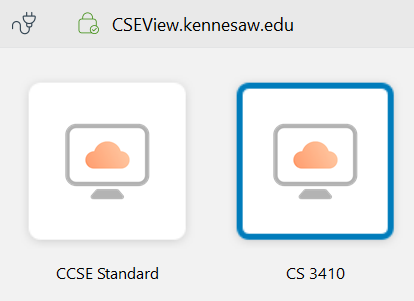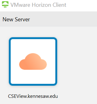 Further, KSU students can access a virtual desktop. The requirements are Windows 7 or Mac OS 10.8 and the corresponding VMWare download. To begin, a student would enter CSEView.kennesaw.edu as the server and connect to that with their credentials. Next, the student may be prompted with several desktop options: CCSE standard or another for a specific course; after selecting the appropriate options the user will be taken to a virtual desktop.
