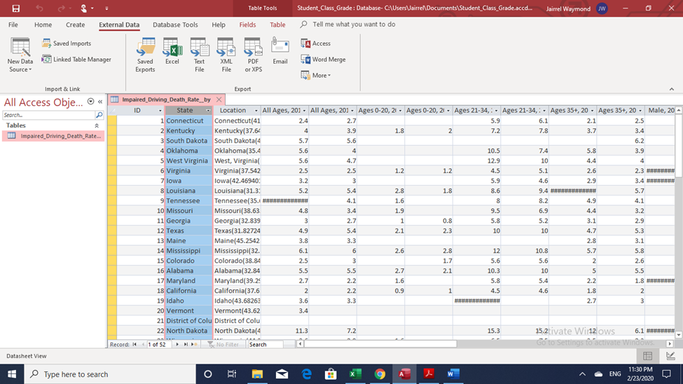 With that said, the following is an example of an SQL query on a csv file turned database. It consists of a single table titled Impaired Driving Death Rate by Age and Gender 2012 2014 All States, and Microsoft Access is used to analyze it.