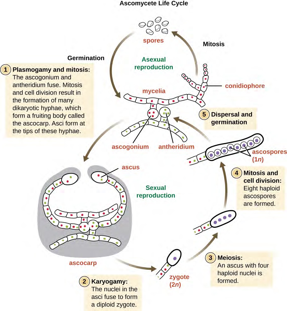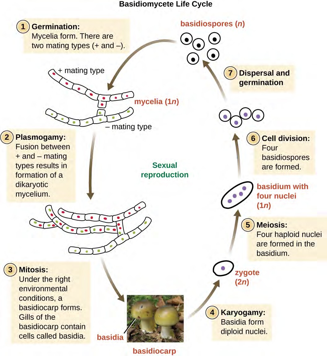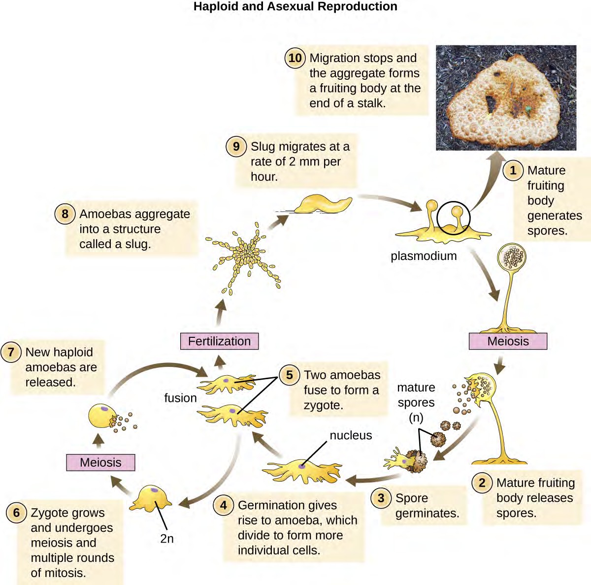 Figure 5.10 The life cycle of the cellular slime mold Dictyostelium discoideum primarily involves individual amoebas but includes the formation of a multinucleate plasmodium formed from a uninucleate zygote (the result of the fusion of two individual amoeboid cells). The plasmodium is able to move and forms a fruiting body that generates haploid spores. (credit “photo”: modification of work by “thatredhead4”/Flickr)