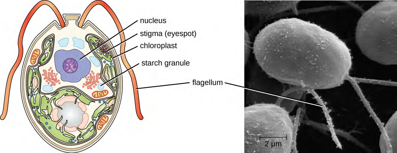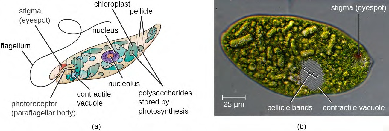Figure 5.17 (a) This illustration of a Euglena shows the characteristic structures, such as the stigma and flagellum.